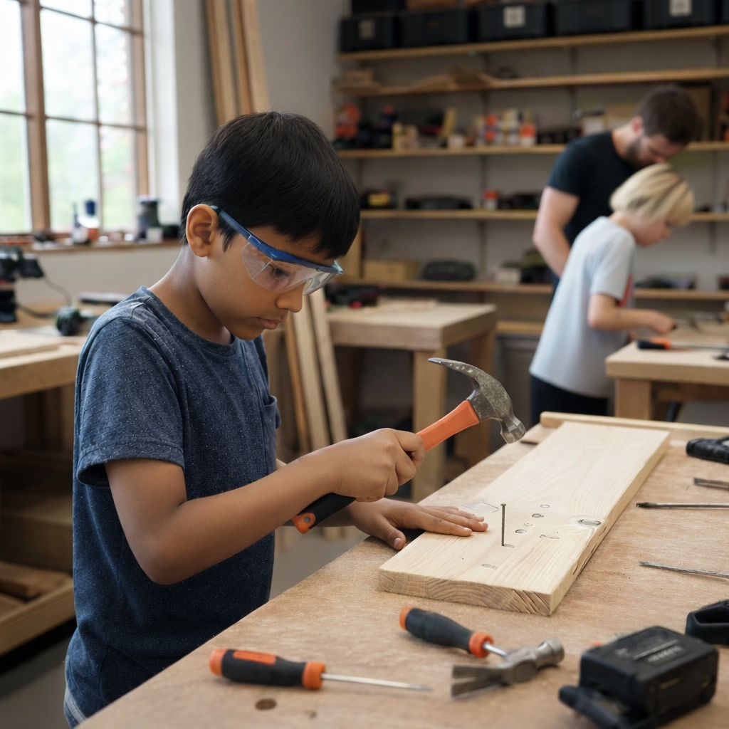 Focus: safe tool handling, foundational measurement, guided instruction, confidence building.